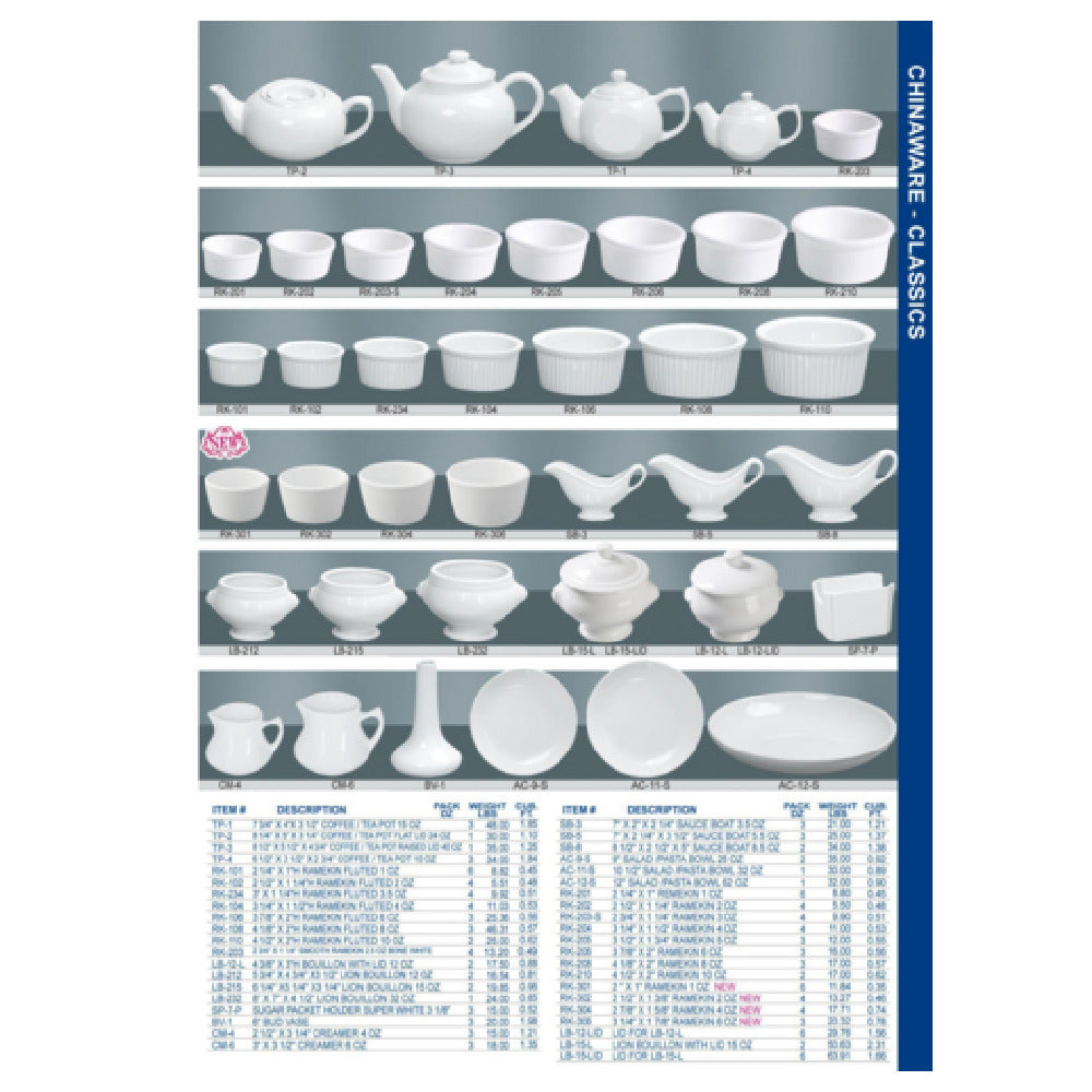 A commercial ramekin is a small, food-safe ceramic dish used for serving sauces, condiments, or side portions in professional kitchens. The Yanco RK-304 model, part of the Yanco Dinnerware Accessories collection, features a 4 oz. capacity, with dimensions of 2 3/4 inches in diameter and 1 1/4 inches high. It is made from high-quality china, approved under Proposition 65 compliance, and is suitable for steady daily use in restaurant or cafeteria environments. Designed for quick cleaning and durable performance, it supports efficient foodservice operations and presentation standards in mid-capacity dining settings.