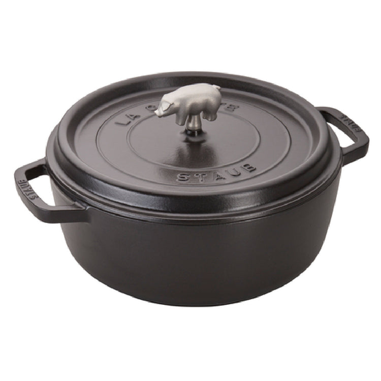 The Zwilling Staub® Cochon Dutch oven distinguishes itself through its enameled cast iron construction, durable black matte finish, and a design optimized for consistent heat distribution. Its wide, round form supports versatile cooking tasks while the pig-shaped knob adds functional aesthetics. Unlike standard models, its oven safety up to 572°F and dishwasher-safe surface enhance operational efficiency in professional kitchens. This model's robust materials and specific dimensions make it suitable for mid-scale foodservice environments requiring durable, reliable cookware for daily use.