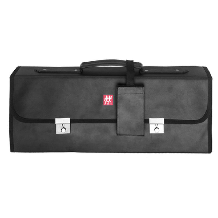 A commercial knife case is a specialized storage device designed for the safe transportation and organization of culinary cutlery. This Zwilling model, the 35070-100, is constructed with a nylon or fabric shell and features designated pockets for multiple knives, supporting HACCP protocols and sanitation standards. It is commonly installed in restaurant back-of-house stations, catering trailers, or institutional kitchens, supporting steady daily workflows and knife management in foodservice settings such as professional kitchens and catering operations.